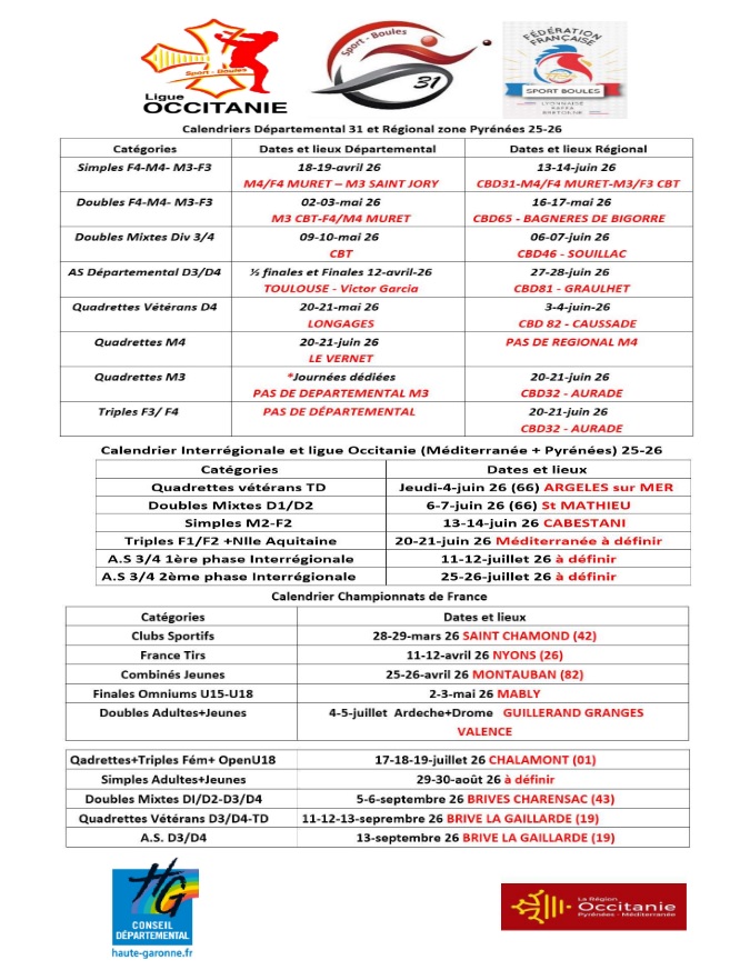 Calendrier Départemental 31 Régional zone Pyr & Méd-2026